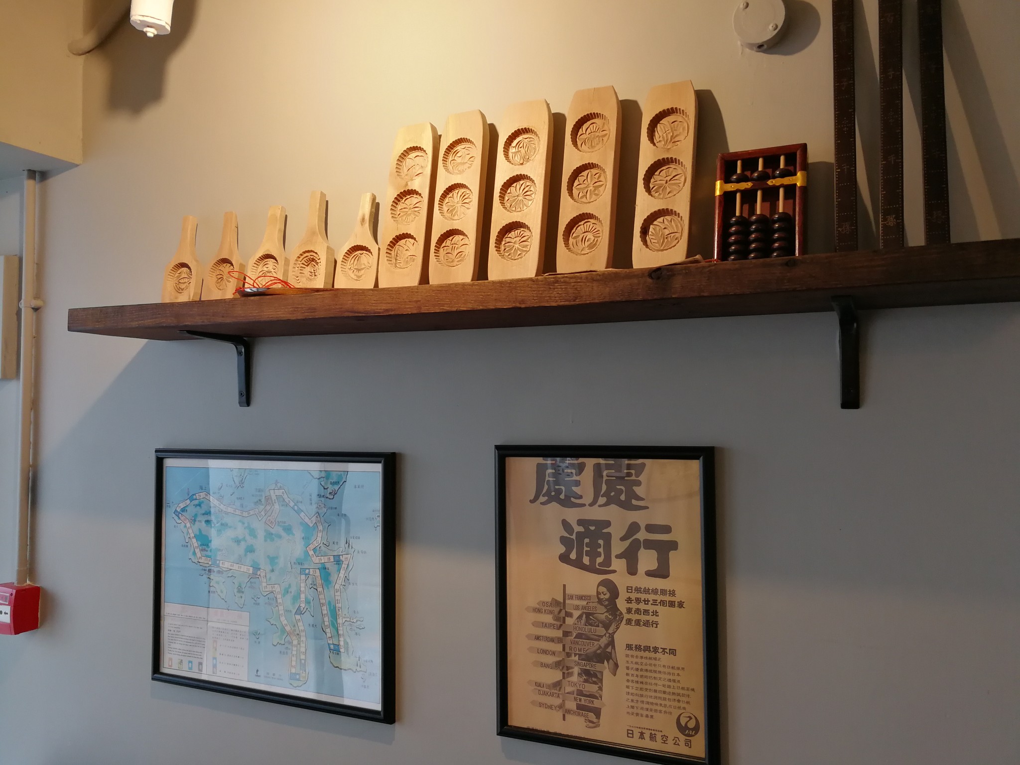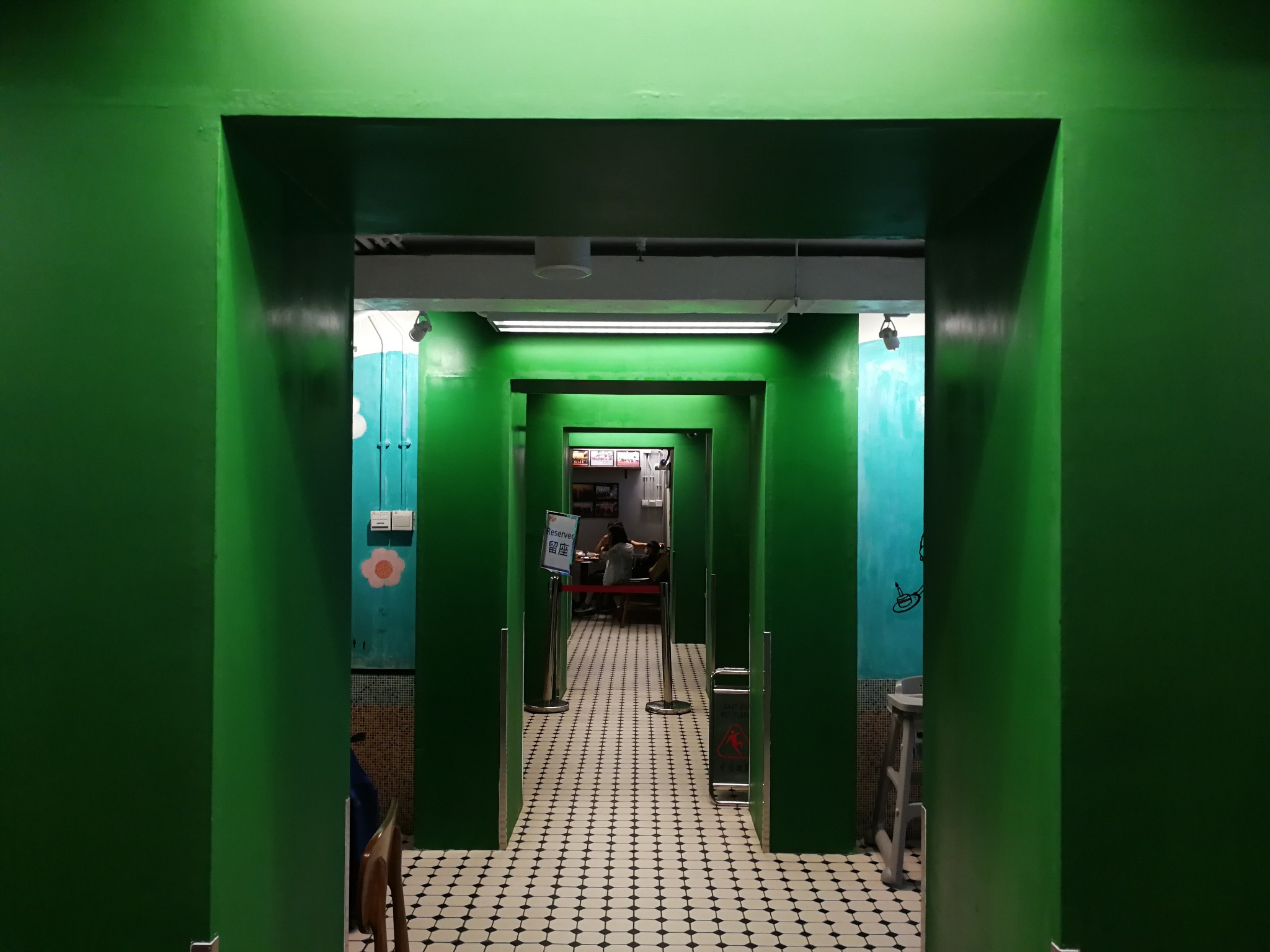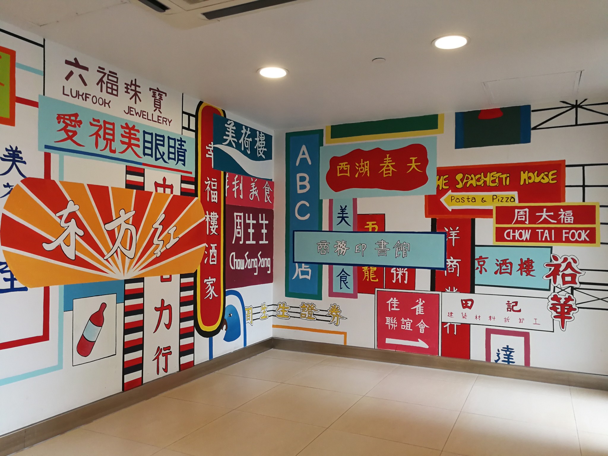 电梯大堂附近房间的墙上绘有大量旧商铺招牌的图案。