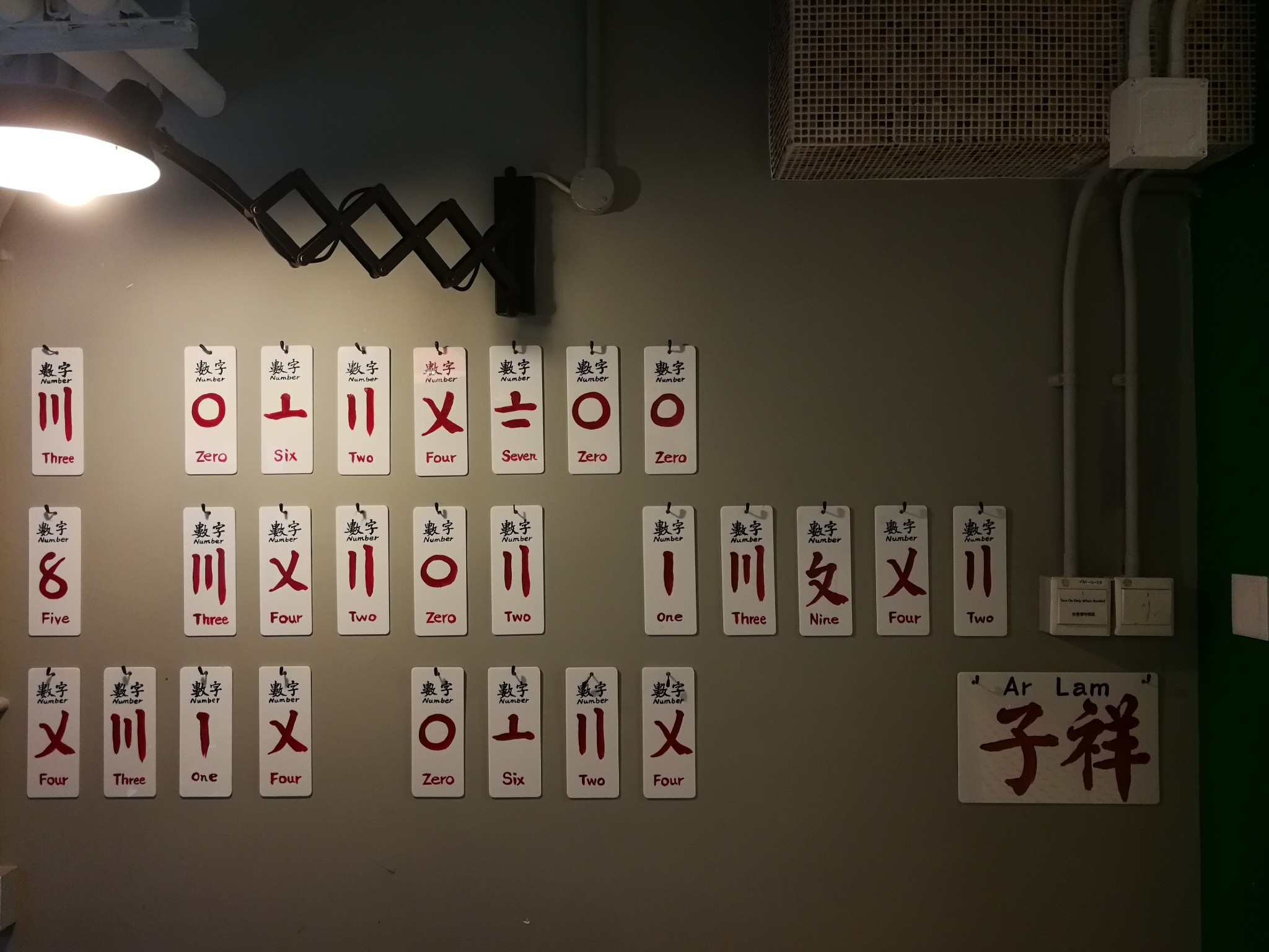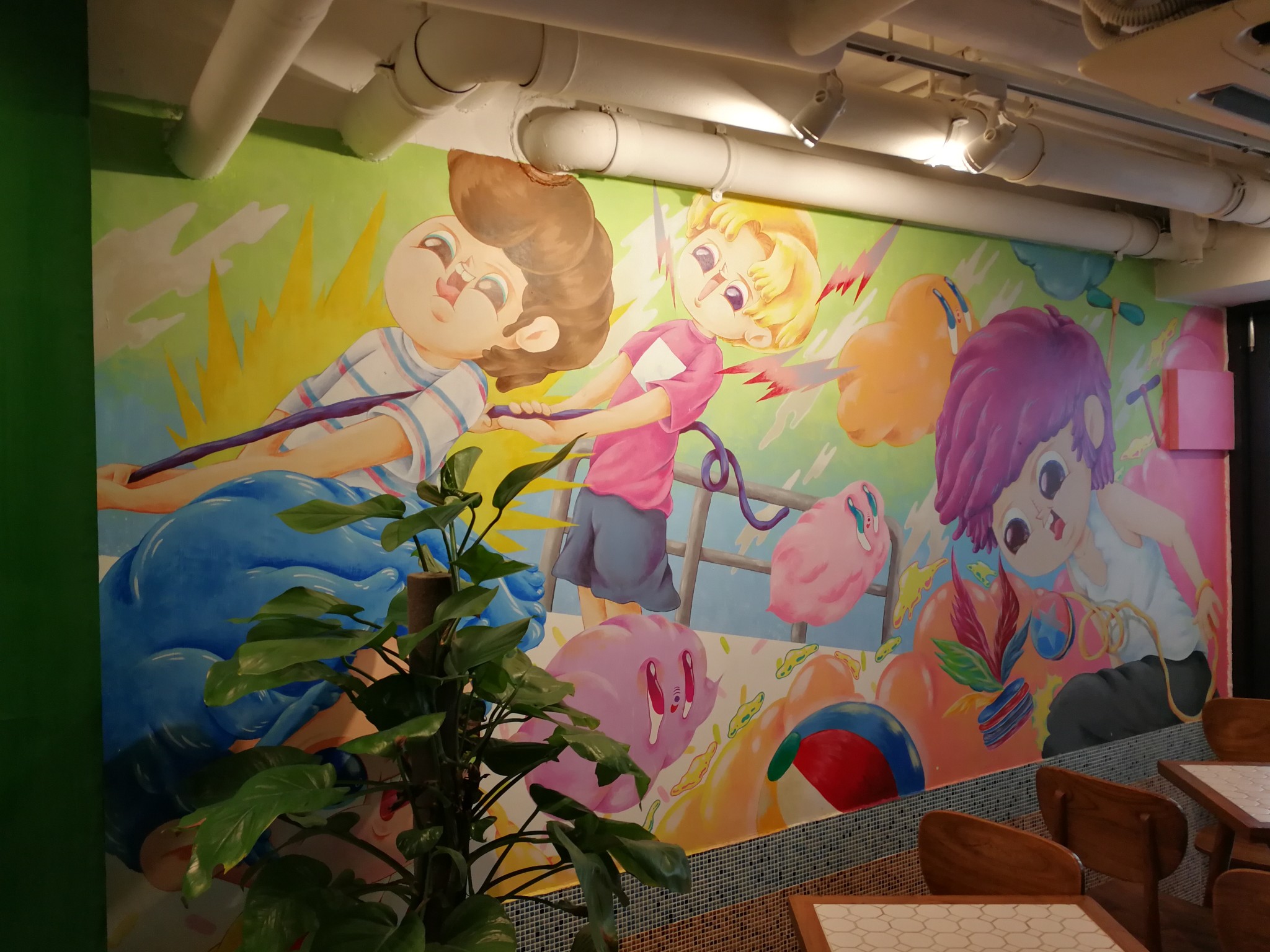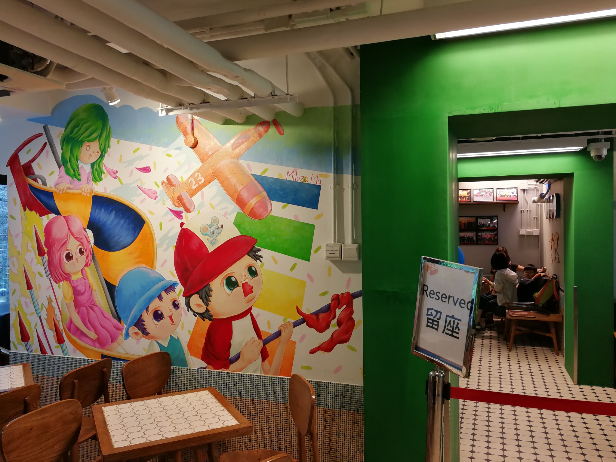 电梯大堂附近房间的墙上绘有大量旧商铺招牌的图案。