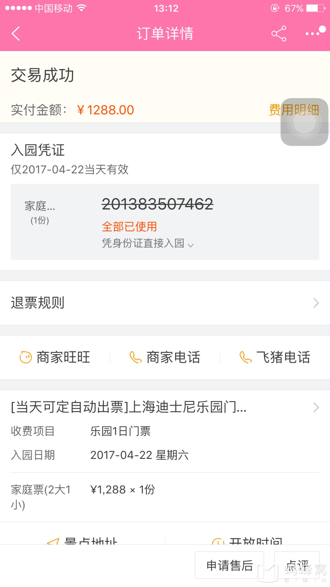 迪士尼门票我是淘宝买的,2大1小 1288元,可以直接刷身份证入~~~~~(其实我们家小的,已经105了),没帮她买票,还是进去了~~~